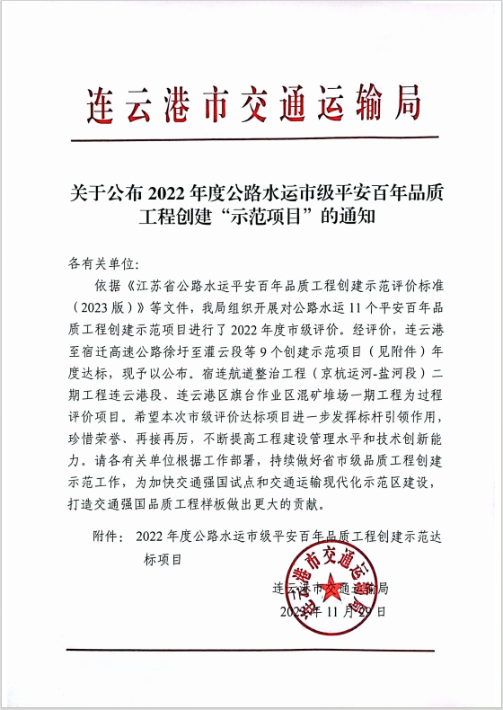 402省道贛榆南環(huán)段路基橋涵工程S402GYNH~SG2標段工程項目順利通過(guò)2022年度公路水運市級平安百年品質(zhì)工程“示范項目”。