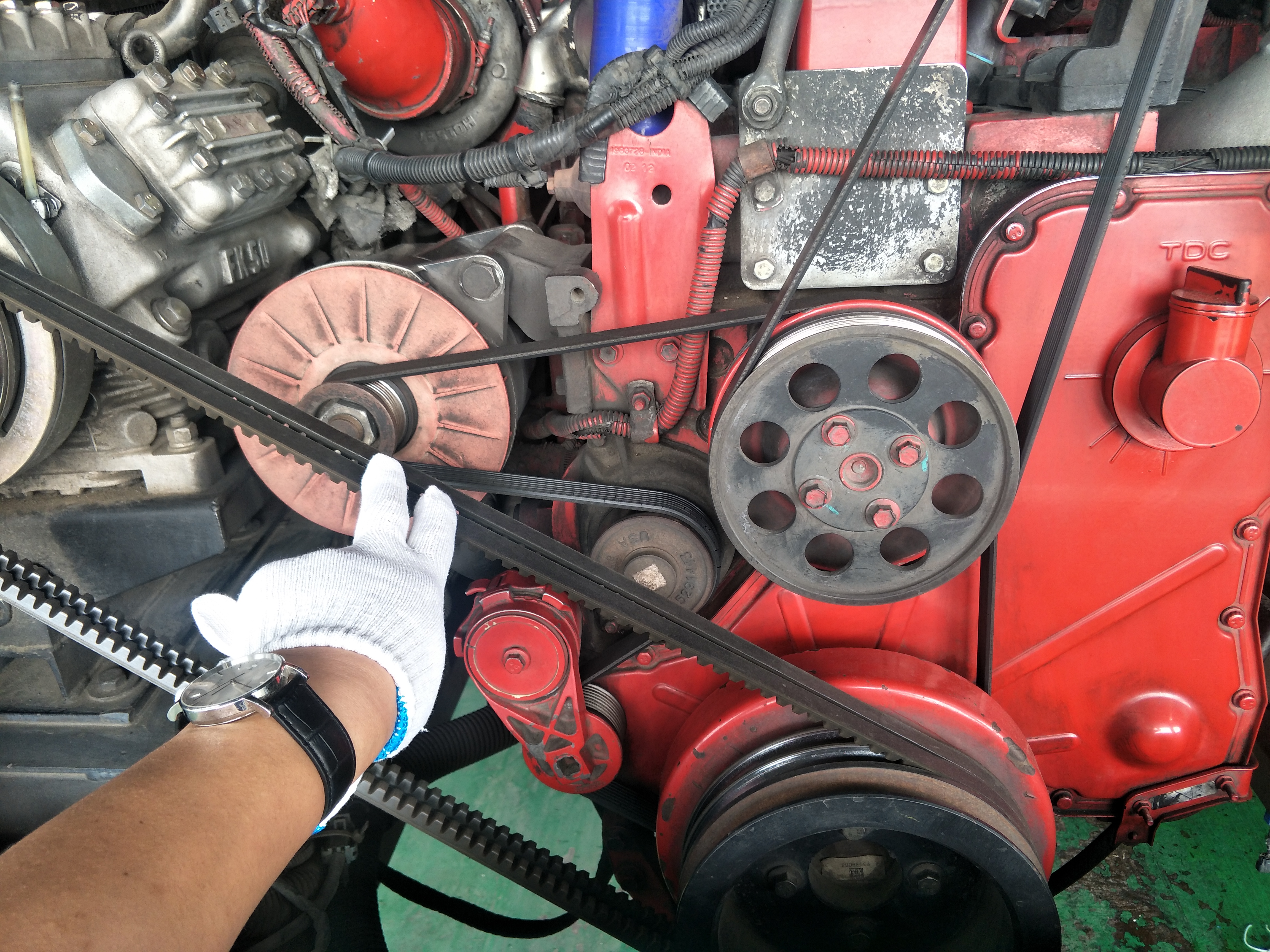 經(jīng)常檢查水泵工作情況和風(fēng)扇皮帶張緊力,風(fēng)扇皮帶不可沾油,防止風(fēng)扇皮帶打滑。要密切注意水泵漏水情況,注意將百葉窗開(kāi)足。