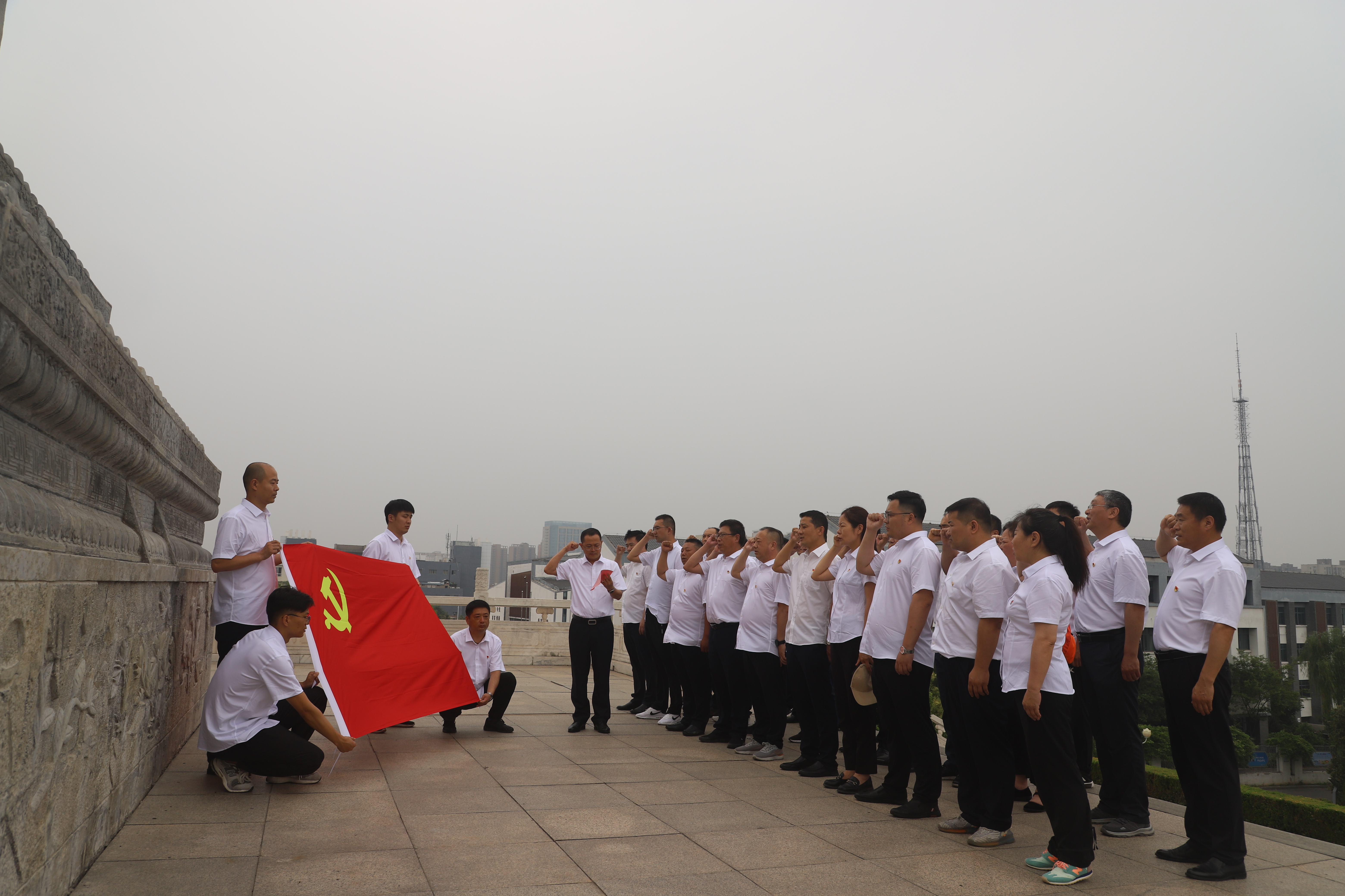 在宿北大戰紀念館內,觀(guān)看了宿遷地區革命斗爭史料,聆聽(tīng)了講解員講解的戰斗英雄的故事,在一組組歷史照片和實(shí)物前大家凝神注目,回顧著(zhù)陳毅等老一輩革命家運籌帷幄、決勝千里的豪放氣質(zhì),感受著(zhù)當年激戰七天七夜的壯烈場(chǎng)景。隨后,前往宿北大戰馬陵山革命烈士紀念塔,在鮮艷的黨旗下,黨員們莊嚴宣誓,重溫了入黨誓詞。