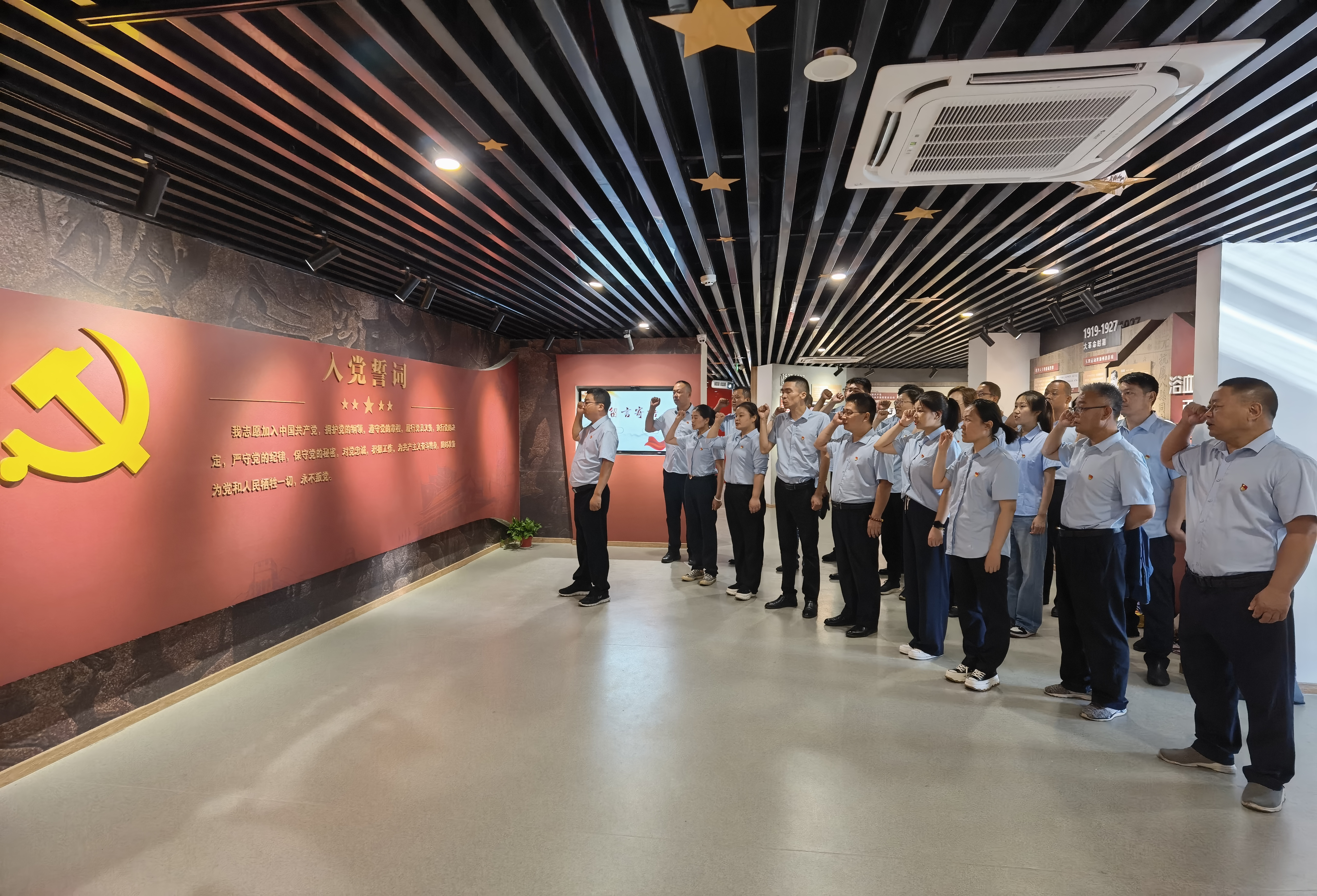 在講解員的引領(lǐng)下,黨員們依次參觀(guān)了“序廳”“文明發(fā)祥、東夷之光”“秦之東門(mén)、軍事要塞”“東方重鎮、絲路繁華”“明清都會(huì )、煙火人家”“百年風(fēng)華、新浦崛起”“海州黨的發(fā)展歷史”7個(gè)板塊,運用翔實(shí)的資料、藝術(shù)的構思以及智能化的手段,生動(dòng)展示了海州上下五千年的地理變化、成長(cháng)足跡、人文景觀(guān),縱覽海州城址在時(shí)間和空間上的演變?;顒?dòng)過(guò)程中,黨員們高舉右拳,莊嚴宣誓,重溫入黨誓詞,重憶入黨初心,響亮的宣誓聲回蕩在黨史館中,也深埋在每一名黨員的心里。