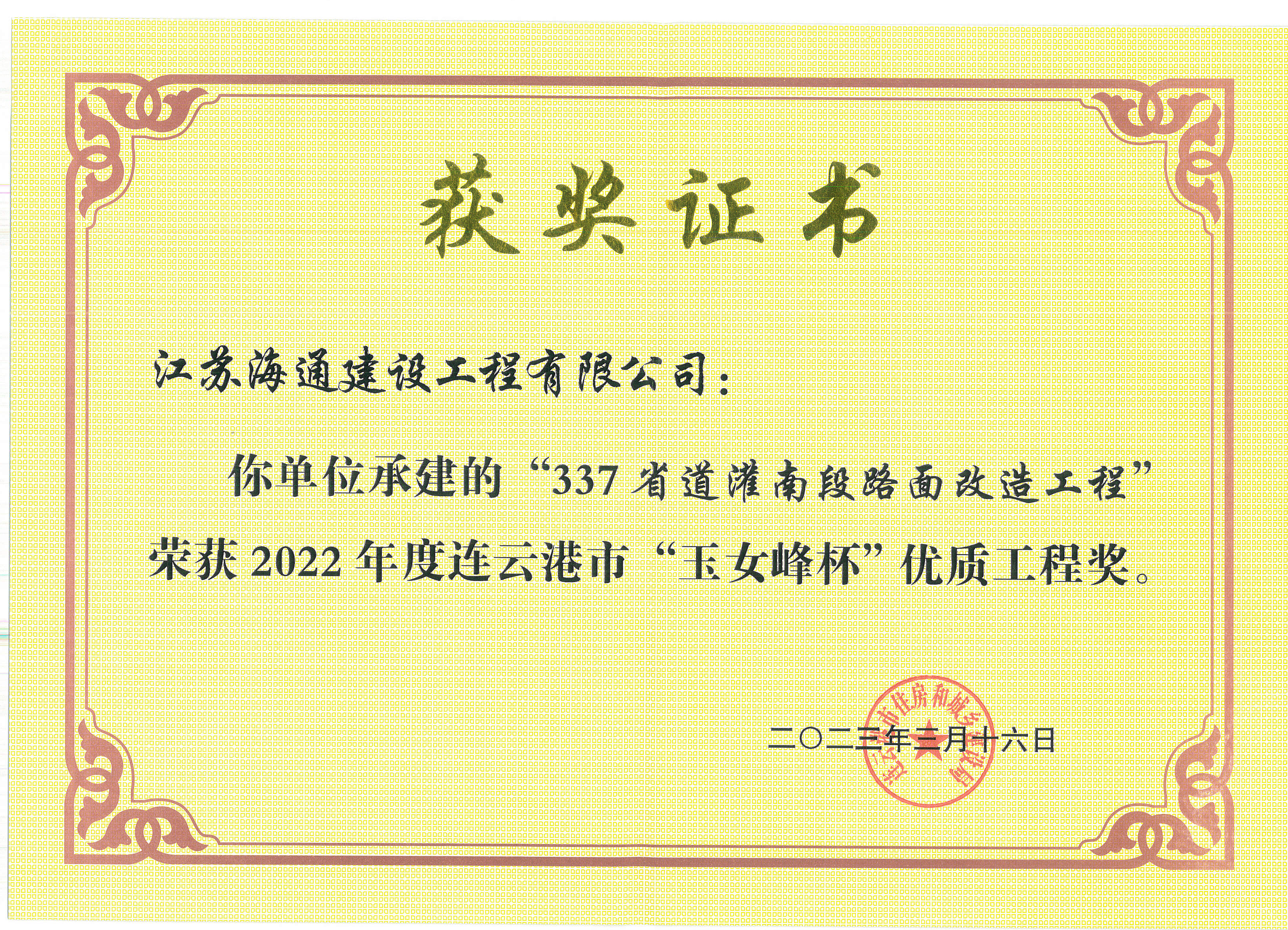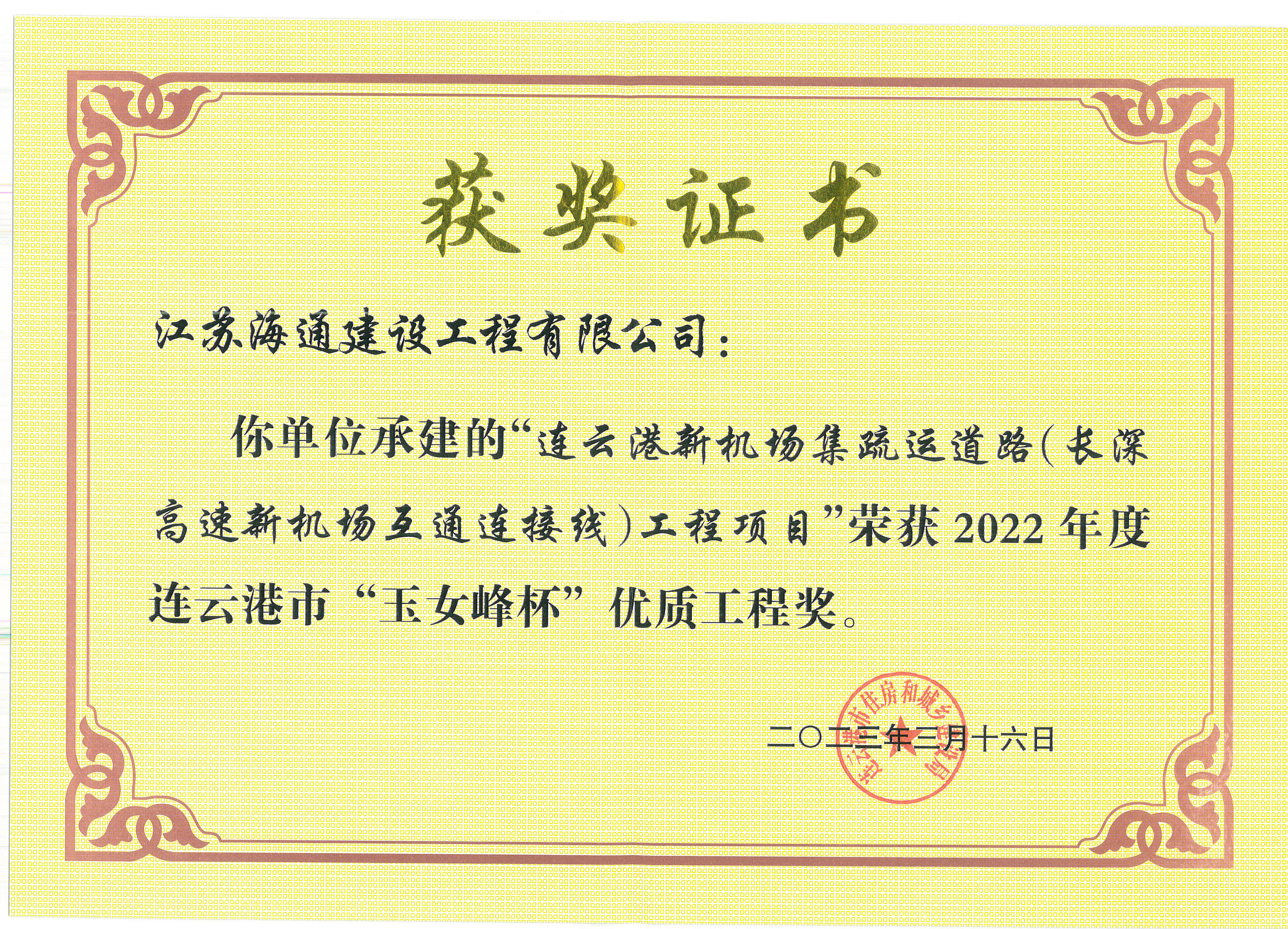 近日,從連云港市住房和城鄉建設局獲悉,由江蘇海建公司承建的337省道灌南段路面改造工程、連云港新機場(chǎng)集疏運道路(長(cháng)深高速新機場(chǎng)互通連接線(xiàn))工程項目、宿徐路(云宿路徐圩支線(xiàn))橋梁工程排淡河橋梁及燒香河橋梁施工項目”三個(gè)項目榮獲2022年度連云港市“玉女峰杯”優(yōu)質(zhì)工程獎。